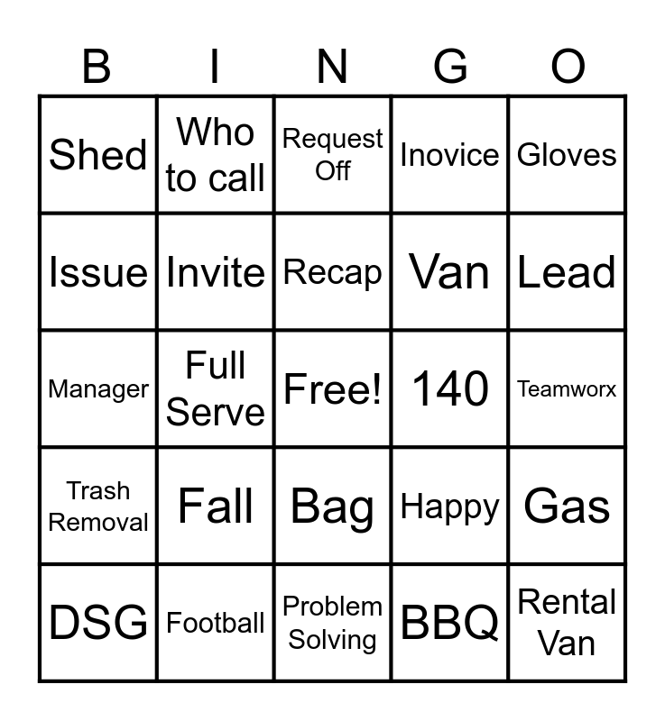 This bingo card has a free space and 24 words: Fall, Football, Recap, DSG, Gloves, Shed, Issue, Who to call, 140, Bag, Van, Manager, Happy, Gas, Invite, BBQ, Teamworx, Request Off, Lead, Full Serve, Rental Van, Trash Removal, Inovice and Problem Solving.