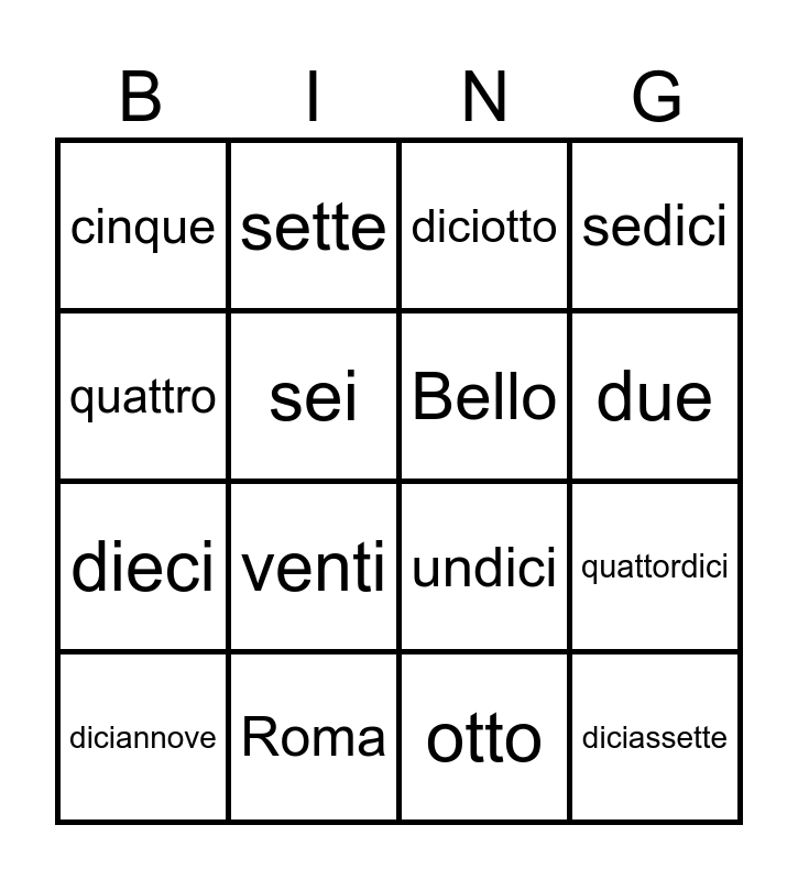 This bingo card has 26 words: Free!, uno, due, tre, quattro, cinque, sei, sette, otto, nove, dieci, undici, dodici, tredici, quattordici, quindici, sedici, diciassette, diciotto, diciannove, venti, Ciao, Roma, Italia, Bello and Buongiorno.