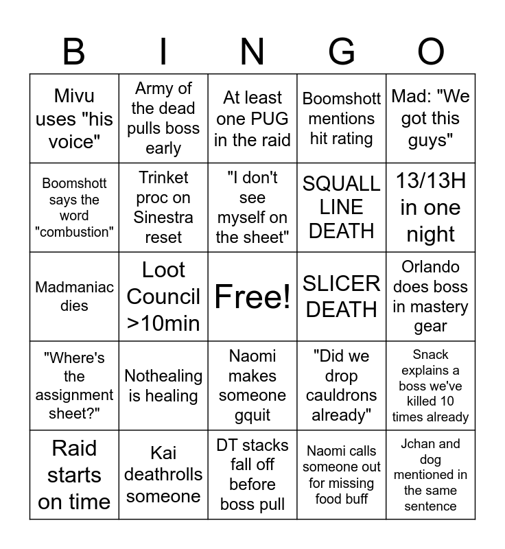This bingo card has a free space and 24 words: Nothealing is healing, Kai deathrolls someone, "I don't see myself on the sheet", Raid starts on time, Mad: "We got this guys", Mivu uses "his voice", Boomshott says the word "combustion", Army of the dead pulls boss early, SLICER DEATH, Naomi makes someone gquit, SQUALL LINE DEATH, Madmaniac dies, "Did we drop cauldrons already", Snack explains a boss we've killed 10 times already, Trinket proc on Sinestra reset, Naomi calls someone out for missing food buff, Orlando does boss in mastery gear, At least one PUG in the raid, 13/13H in one night, Loot Council >10min, Jchan and dog mentioned in the same sentence, "Where's the assignment sheet?", Boomshott mentions hit rating and DT stacks fall off before boss pull.