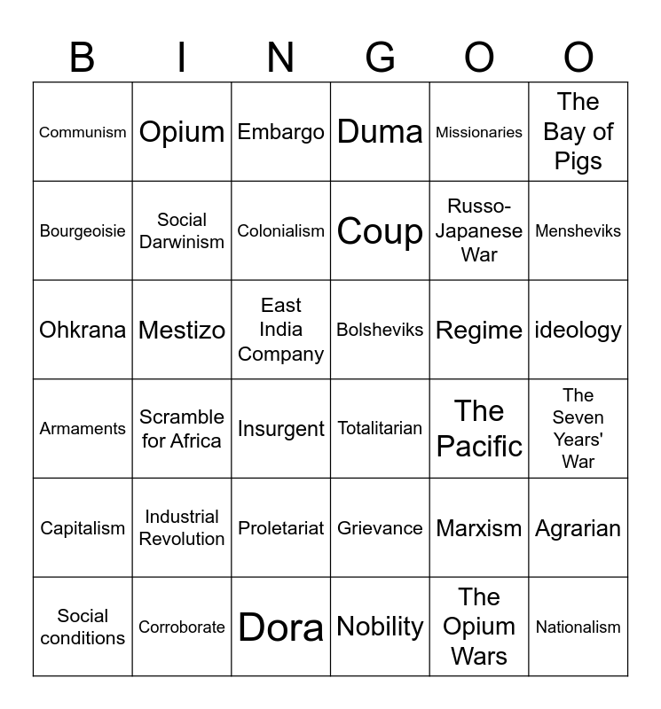 This bingo card has 36 words: Grievance, Proletariat, Nobility, Bourgeoisie, Armaments, Bolsheviks, Social Darwinism, Dora, Missionaries, Marxism, Mensheviks, Duma, Agrarian, Mestizo, Coup, Communism, Capitalism, Regime, Ohkrana, Embargo, East India Company, Scramble for Africa, Totalitarian, Insurgent, The Pacific, Opium, Russo-Japanese War, Corroborate, Colonialism, The Bay of Pigs, Nationalism, Social conditions, The Seven Years' War, ideology, Industrial Revolution and The Opium Wars.