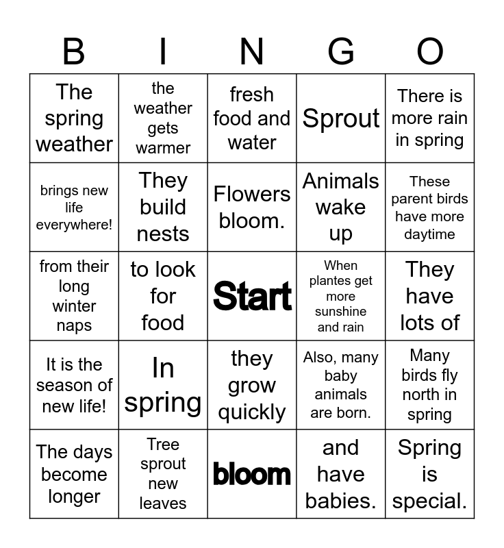 This bingo card has a free space and 24 words: In spring, Tree sprout new leaves, Flowers bloom., The days become longer, There is more rain in spring, The spring weather, brings new life everywhere!, the weather gets warmer, When plantes get more sunshine and rain, they grow quickly, Animals wake up, from their long winter naps, Also, many baby animals are born., Many birds fly north in spring, They build nests, and have babies., They have lots of, fresh food and water, These parent birds have more daytime, to look for food, Spring is special., It is the season of new life!, Sprout and bloom.