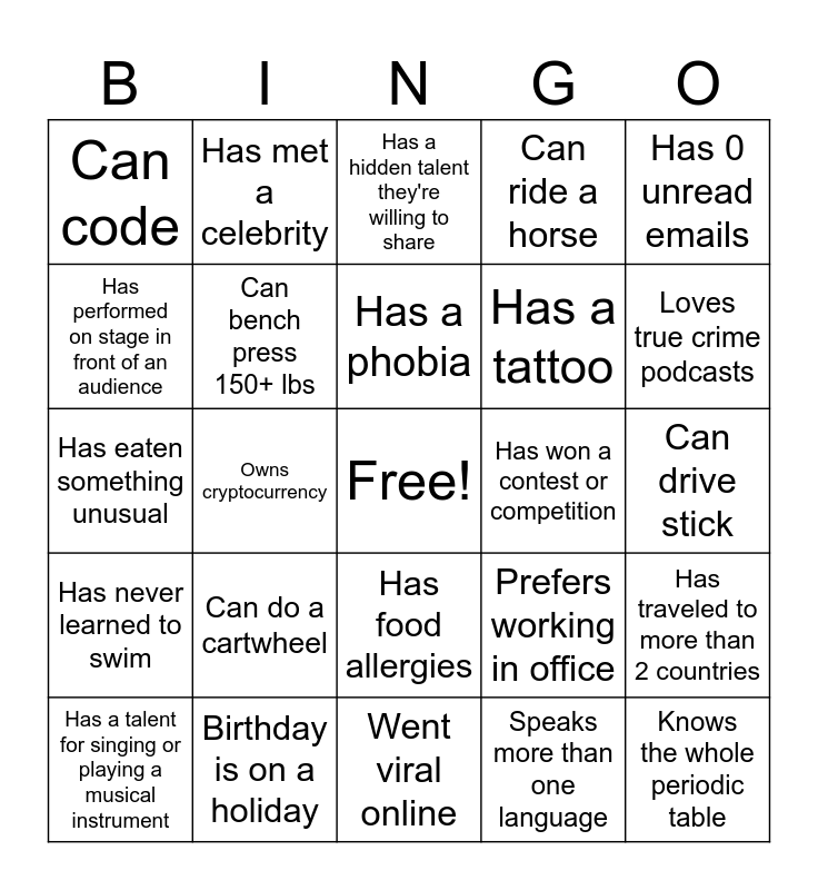 This bingo card has a free space and 28 words: Has traveled to more than 2 countries, Has a pet, Has a tattoo, Speaks more than one language, Has performed on stage in front of an audience, Has a hidden talent they're willing to share, Has met a celebrity, Has never learned to swim, Has won a contest or competition, Has a talent for singing or playing a musical instrument, Has eaten something unusual, Can ride a horse, Birthday is on a holiday, Went viral online, Loves true crime podcasts, Been on a bad blind date, Can do a cartwheel, Can bench press 150+ lbs, Has a phobia, Has food allergies, Can code, Can bake a cake from scratch, Knows the whole periodic table, Owns cryptocurrency, Can drive stick, Prefers working in office, Has 0 unread emails and Is a twin/triplet.