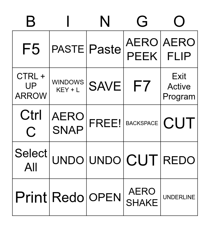This bingo card has a free space and 49 words: F1, UNDERLINE, COPY, OPEN, UNDO, RENAME, PASTE, CREATE A NEW FOLDER, CTRL + UP ARROW, DELETE, WINDOWS KEY + L, AERO PEEK, REDO, CUT, EXIT ACTIVE PROGRAM, SELECT ALL, SAVE, BACKSPACE, PRINT, AERO FLIP, AERO SNAP, AERO SHAKE, F5, F7, Cut, Exit Active Program, Print, 2, UNDO, Select All, What is Word, Back Space, Mouse, DELETE, Redo, Monitor, Free, 1991, CUT, Rename, Laptop, Keyboard, Artificial intelligence, CTRL P, Ctrl C, Paste, Rotweiler, Underline and ASDFGHJKL.