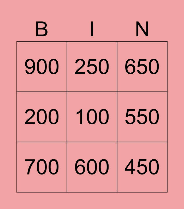 This bingo card has a free space and 17 words: 50, 300, 650, 900, 400, 200, 950, 700, 600, 550, 350, 100, 450, 250, 650, 750 and 300.