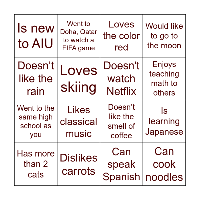 This bingo card has 16 words: Dislikes carrots, Is learning Japanese, Loves the color red, Is new to AIU, Went to the same high school as you, Went to Doha, Qatar to watch a FIFA game, Doesn’t like the smell of coffee, Can speak Spanish, Doesn’t like the rain, Loves skiing, Has more than 2 cats, Would like to go to the moon, Likes classical music, Enjoys teaching math to others, Doesn't watch Netflix and Can cook noodles.