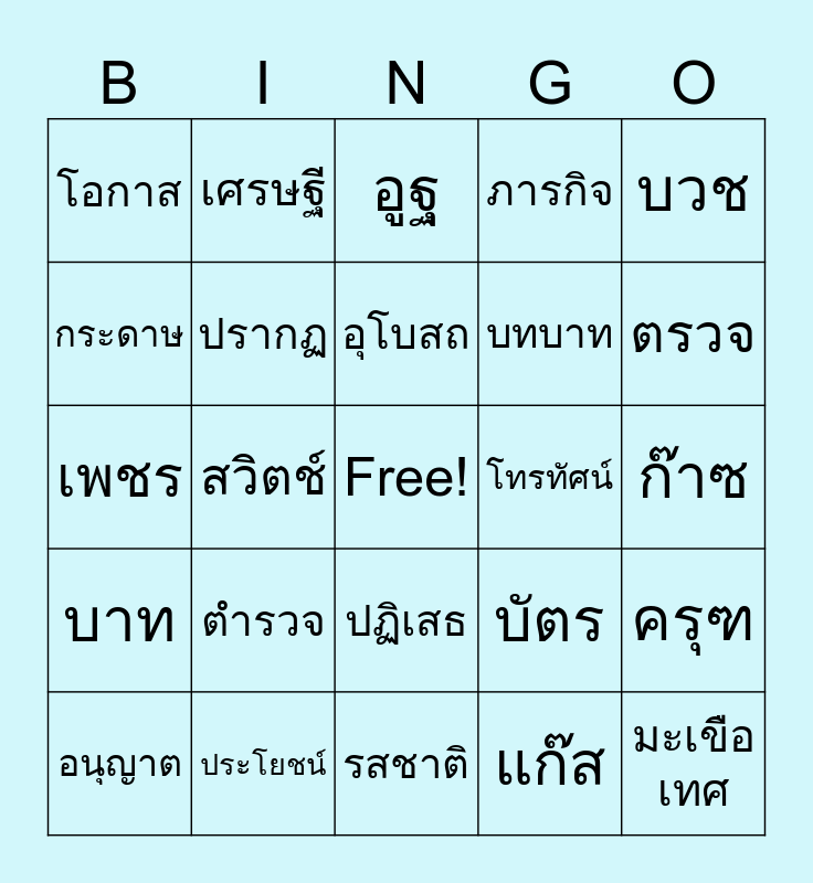 This bingo card has a free space and 24 words: ตำรวจ, ประโยชน์, อุโบสถ, อนุญาต, บวช, โอกาส, กระดาษ, เศรษฐี, โทรทัศน์, ปฏิเสธ, บทบาท, เพชร, บัตร, ครุฑ, ปรากฏ, แก๊ส, ก๊าซ, อูฐ, ตรวจ, สวิตช์, มะเขือเทศ, บาท, ภารกิจ and รสชาติ.