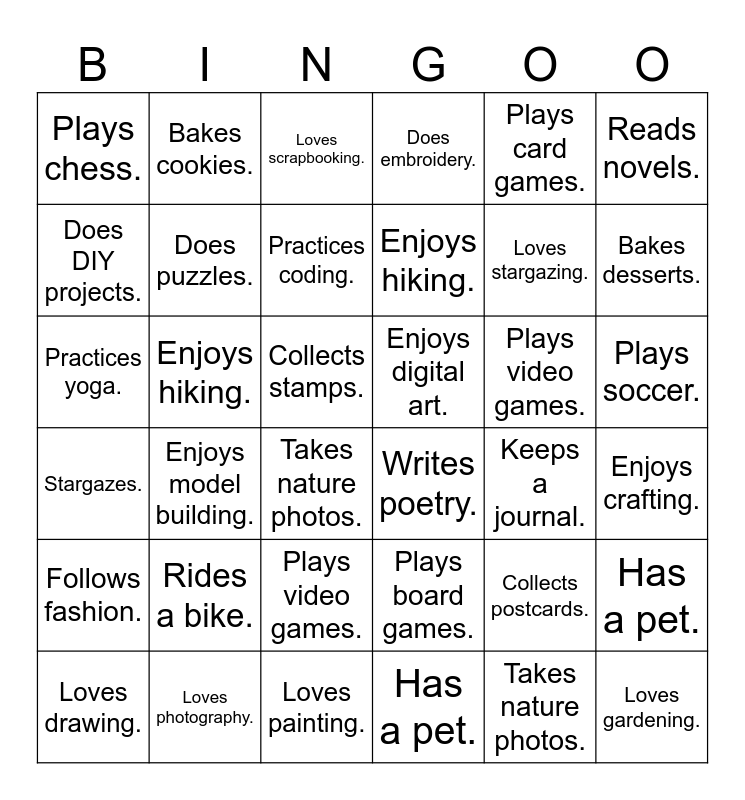This bingo card has 67 words: Free!, Loves drawing., Enjoys journaling., Collects stamps., Plays board games., Practices calligraphy., Reads novels., Enjoys knitting., Does puzzles., Loves painting., Writes poetry., Collects coins., Enjoys crafting., Plays chess., Does origami., Loves scrapbooking., Enjoys digital art., Plays card games., Writes stories., Does DIY projects., Enjoys model building., Practices coding., Does embroidery., Collects postcards., Enjoys solving riddles., Creates jewelry., Loves photography., Practices yoga., Enjoys hiking., Takes nature photos., Bakes desserts., Loves stargazing., Plays soccer., Enjoys gardening., Has a pet., Plays video games., Loves photography., Practices yoga., Enjoys hiking., Takes nature photos., Bakes desserts., Loves stargazing., Plays soccer., Enjoys gardening., Has a pet., Plays video games., Enjoys painting., Keeps a journal., Loves gardening., Follows fashion., Bakes cookies., Volunteers often., Collects items., Enjoys history shows., Follows a sports team., Stargazes., Rides a bike., Speaks another language., Cares for plants., Loves ice cream., Has a pet., Enjoys hiking., Plays a musical instrument., Reads mystery books., Traveled abroad., Loves cooking. and Watches scary movies..
