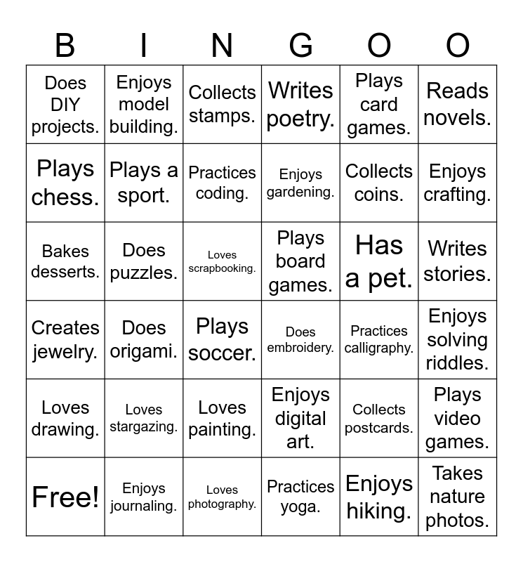 This bingo card has 37 words: Free!, Loves drawing., Enjoys journaling., Collects stamps., Plays board games., Practices calligraphy., Reads novels., Enjoys knitting., Does puzzles., Loves painting., Writes poetry., Collects coins., Enjoys crafting., Plays chess., Does origami., Loves scrapbooking., Enjoys digital art., Plays card games., Writes stories., Does DIY projects., Enjoys model building., Practices coding., Does embroidery., Collects postcards., Enjoys solving riddles., Creates jewelry., Plays a sport., Loves photography., Practices yoga., Enjoys hiking., Takes nature photos., Bakes desserts., Loves stargazing., Plays soccer., Enjoys gardening., Has a pet. and Plays video games..