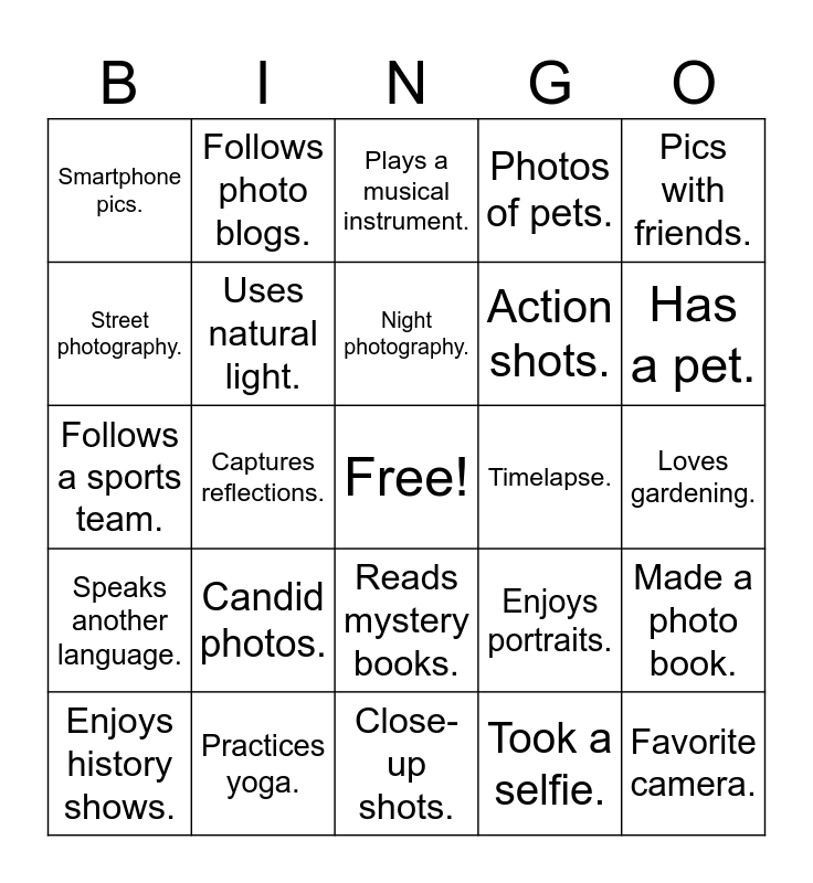 This bingo card has a free space and 50 words: Loves nature photos., Favorite camera., Edits pictures., Close-up shots., Candid photos., Black & white pics., Follows photo blogs., Captures sunsets., Street photography., Photo contest., Uses natural light., Photos of pets., Made a photo book., Enjoys portraits., Went to a workshop., Photos of meals., Night photography., Timelapse., Uses photo apps., Pics with friends., Captures reflections., Took a selfie., Smartphone pics., Action shots., Macro photography., Loves ice cream., Has a pet., Enjoys hiking., Plays a musical instrument., Reads mystery books., Traveled abroad., Loves cooking., Watches scary movies., Plays video games., Practices yoga., Loves dancing., Into fitness., Enjoys painting., Keeps a journal., Loves gardening., Follows fashion., Bakes cookies., Volunteers often., Collects items., Enjoys history shows., Follows a sports team., Stargazes., Rides a bike., Speaks another language. and Cares for plants..