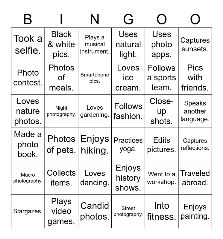 This bingo card has 51 words: Free!, Loves nature photos., Favorite camera., Edits pictures., Close-up shots., Candid photos., Black & white pics., Follows photo blogs., Captures sunsets., Street photography., Photo contest., Uses natural light., Photos of pets., Made a photo book., Enjoys portraits., Went to a workshop., Photos of meals., Night photography., Timelapse., Uses photo apps., Pics with friends., Captures reflections., Took a selfie., Smartphone pics., Action shots., Macro photography., Loves ice cream., Has a pet., Enjoys hiking., Plays a musical instrument., Reads mystery books., Traveled abroad., Loves cooking., Watches scary movies., Plays video games., Practices yoga., Loves dancing., Into fitness., Enjoys painting., Keeps a journal., Loves gardening., Follows fashion., Bakes cookies., Volunteers often., Collects items., Enjoys history shows., Follows a sports team., Stargazes., Rides a bike., Speaks another language. and Cares for plants..