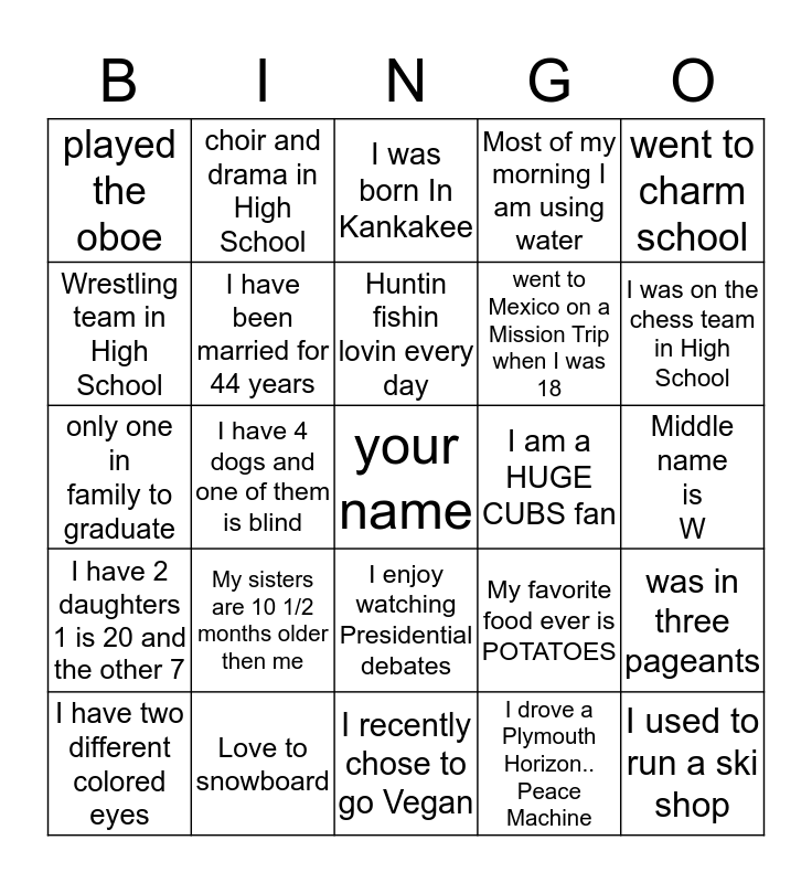 This bingo card has a free space and 24 words: My sisters are 10 1/2 months older then me, Love to snowboard, Huntin fishin lovin every day, I have two different colored eyes, went to charm school, played the oboe, Wrestling team in High School, choir and drama in High School, I am a HUGE CUBS fan, I enjoy watching Presidential debates, went to Mexico on a Mission Trip when I was 18, only one in family to graduate, My favorite food ever is POTATOES, was in three pageants, I have been married for 44 years, I drove a Plymouth Horizon.. Peace Machine, Middle name is W, I was born In Kankakee, I was on the chess team in High School, I have 4 dogs and one of them is blind, I used to run a ski shop, I have 2 daughters 1 is 20 and the other 7, Most of my morning I am using water and I recently chose to go Vegan.