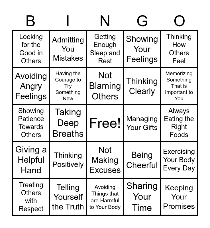 This bingo card has a free space and 24 words: Thinking Positively, Telling Yourself the Truth, Not Blaming Others, Treating Others with Respect, Thinking How Others Feel, Looking for the Good in Others, Avoiding Angry Feelings, Admitting You Mistakes, Managing Your Gifts, Not Making Excuses, Thinking Clearly, Showing Patience Towards Others, Being Cheerful, Exercising Your Body Every Day, Having the Courage to Try Something New, Sharing Your Time, Always Eating the Right Foods, Getting Enough Sleep and Rest, Memorizing Something That is Important to You, Taking Deep Breaths, Keeping Your Promises, Giving a Helpful Hand, Showing Your Feelings and Avoiding Things that are Harmful to Your Body.