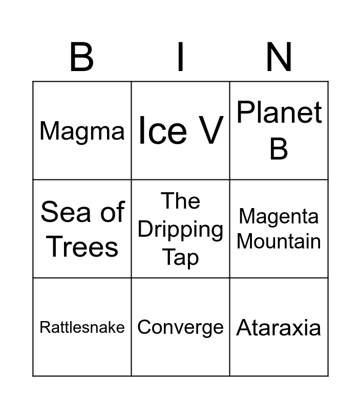 This bingo card has a free space and 8 words: Magenta Mountain, Planet B, Ice V, Rattlesnake, Magma, Ataraxia, Sea of Trees and Converge.