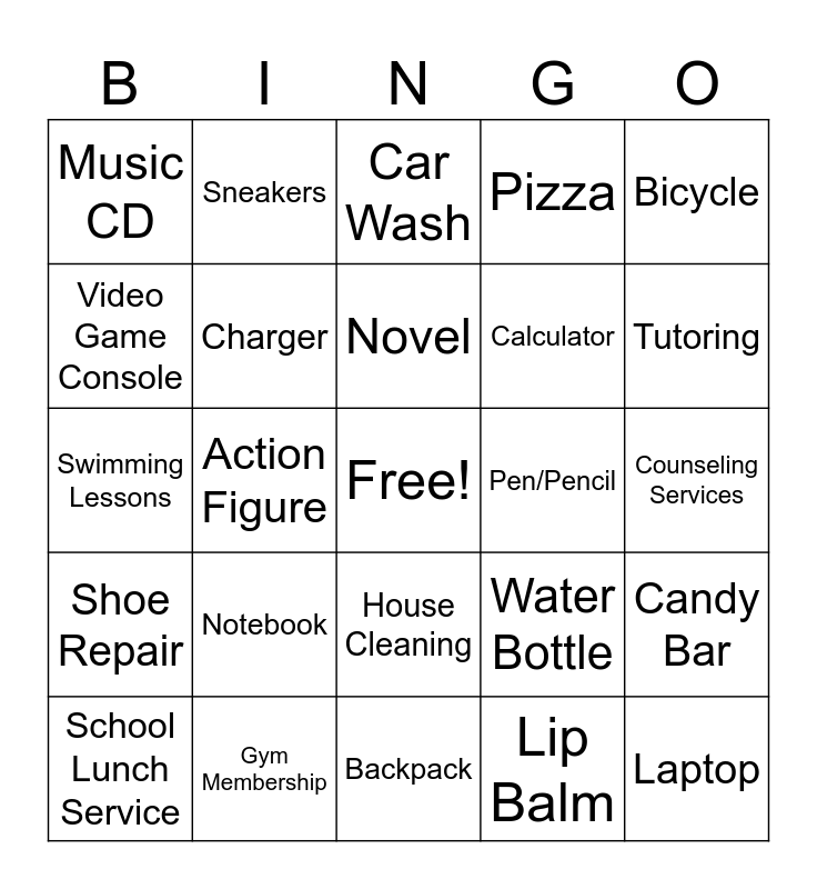 This bingo card has a free space and 50 words: Smartphone, Laptop, Headphones, Backpack, Notebook, T-shirt, Sneakers, Basketball, Video Game Console, Tablet, Charger, Pizza, Candy Bar, Water Bottle, Skateboard, Board Game, Novel, Pen/Pencil, Hoodie, Bicycle, Action Figure, Lip Balm, Music CD, Calculator, Poster, Haircut, Tutoring, Dog Walking, Car Wash, House Cleaning, Pizza Delivery, Plumbing, Taxi Ride, Streaming Subscription (e.g., Netflix), Gym Membership, Library Borrowing Services, School Bus Transportation, Medical Check-Up, Music Lessons, Counseling Services, Sports Coaching, Photo Printing, Computer Repair, Online Gaming Subscription, School Lunch Service, Swimming Lessons, Birthday Party Planning, Bike Repair, Shoe Repair and Concert Ticket.