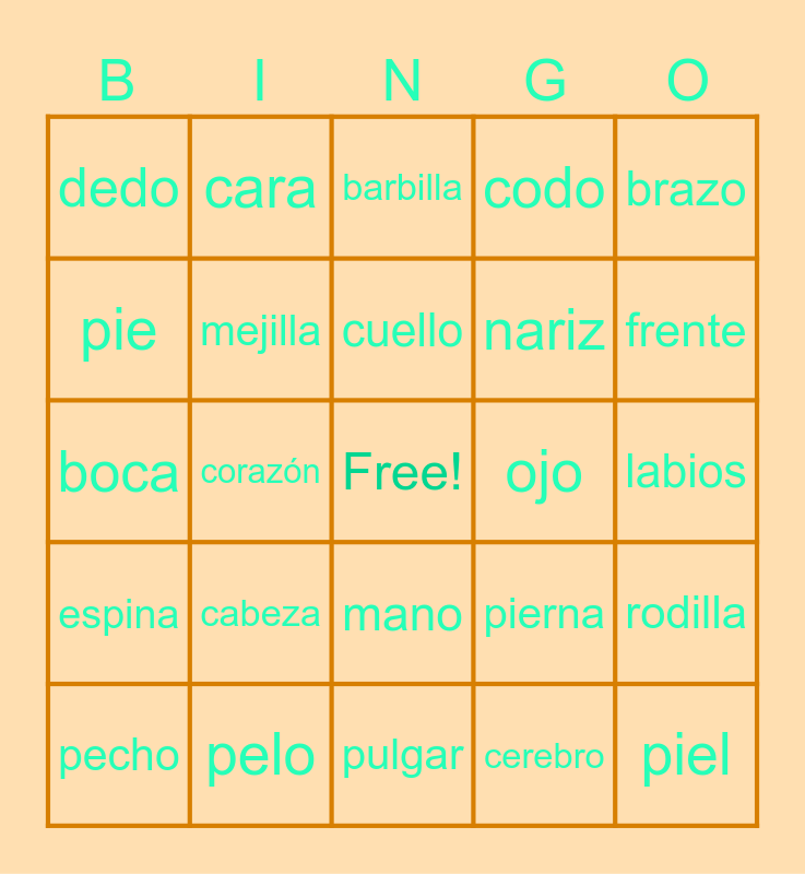 This bingo card has a free space and 24 words: cabeza, pelo, cuello, pecho, brazo, dedo, pie, cara, ojo, mano, nariz, boca, pierna, rodilla, mejilla, cerebro, labios, barbilla, frente, corazón, piel, espina, codo and pulgar.