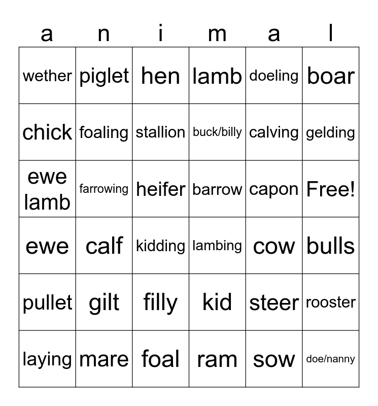 This bingo card has 37 words: steer, kid, sow, chick, calf, capon, foaling, ram, doeling, laying, gelding, lamb, ewe lamb, heifer, boar, barrow, gilt, hen, Free!, farrowing, wether, buck/billy, kidding, cow, mare, bulls, piglet, foal, rooster, filly, wether, lambing, calving, pullet, ewe, stallion and doe/nanny.