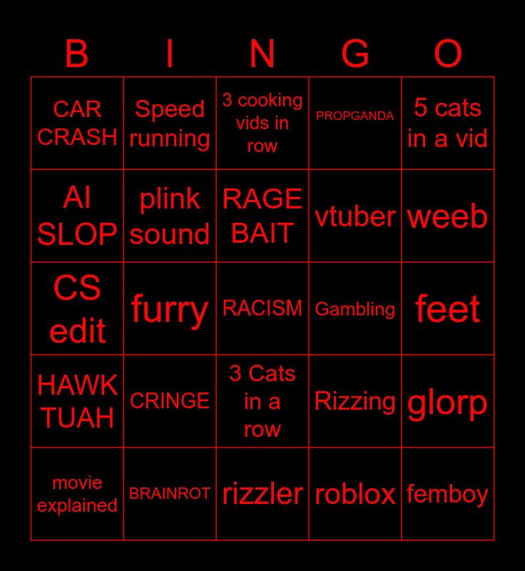 This bingo card has a free space and 24 words: CRINGE, BRAINROT, RAGE BAIT, movie explained, 5 cats in a vid, CAR CRASH, AI SLOP, Speed running, Gambling, 3 Cats in a row, vtuber, CS edit, Rizzing, glorp, plink sound, roblox, feet, 3 cooking vids in row, weeb, furry, femboy, HAWK TUAH, PROPGANDA and rizzler.