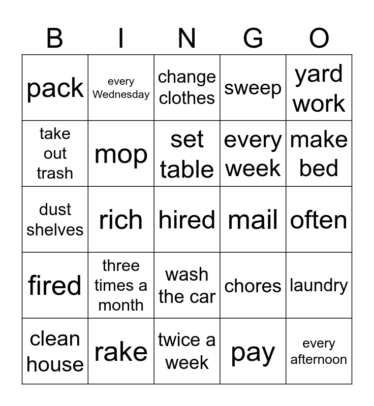 This bingo card has 35 words: water plants, pick up kids, shopping, mop, wash the car, sweep, take out trash, mow, set table, put clothes away, dust shelves, yard work, change oil, bring animal to vet, pack, mail, pay, rich, fired, hired, chores, clean house, laundry, rake, change clothes, make bed, every afternoon, every morning, every week, often, once in a while, twice a week, three times a month, every Wednesday and every Tuesday.