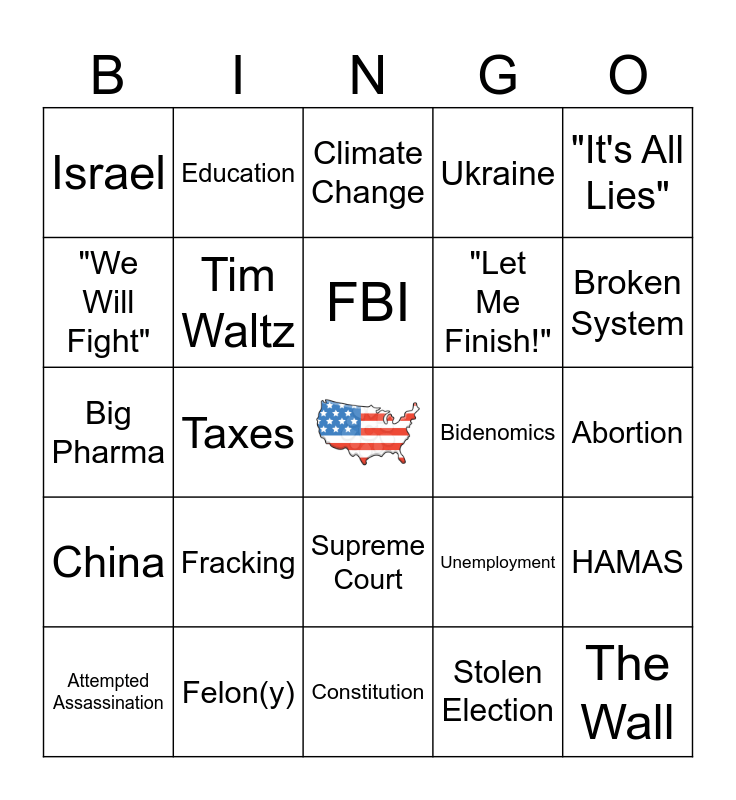 This bingo card has a free space and 69 words: Southern Border, Abortion, Healthcare, Medicare or Medicaid, Felon(y), Inflation, Ukraine, Covid, "It's All Lies", Illegal Immigrants, HAMAS, Fentanyl, Israel, Climate Change, Black Jobs, Taxes, Supreme Court, "Let Me Finish!", Ukraine, China, Bidenomics, Unemployment, Broken System, J6, "Here's The Deal", Electric Cars, Fake News, Deep State, Stolen Election, Project 2025, Education, "Let's Be Clear", Foreign Policy, Critical Race Theory, Interrupts Moderator, Swamp, Middle Class, Witch Hunt, "We Will Fight", Radical Left, Fracking, The Wall, No Tax on Tips, Weird, Unflattering Nickname Used for Opponent, Attempted Assassination, Hillbilly Elligy, Tampons in Men's Restrooms, JD Vance, Tim Waltz, FBI, Military, WOKE, Constitution, Social Security, LGBTQ/ Trans Rights, Elon Musk, Tusli Gabbard, RFK Jr., Big Pharma, God Bless America, Crime, Military Reference, Kamala Laughs, MAGA, Border Czar, 2nd Ammendment, America First and Gaza.
