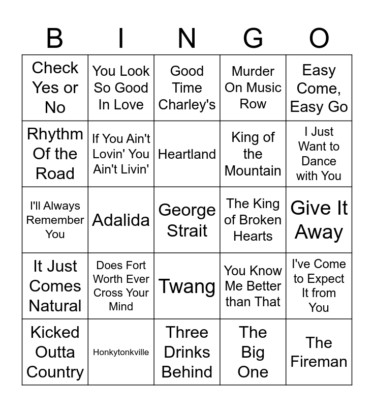 This bingo card has a free space and 52 words: Unwound, The Fireman, The Cowboy Rides Away, Three Drinks Behind, Does Fort Worth Ever Cross Your Mind, Fool Hearted Memory, You Look So Good In Love, The Chair, Rhythm Of the Road, Ocean Front Property, If You Ain't Lovin' You Ain't Livin', Ace In the Hole, I've Come to Expect It from You, You Know Me Better than That, The Chill of an Early Fall, Gone As a Girl Can Get, Heartland, The King of Broken Hearts, When Did You Stop Loving Me, Easy Come, Easy Go, Adalida, The Big One, Check Yes or No, King of the Mountain, Blue Clear Sky, Round About Way, Carrying Your Love with Me, True, I Just Want to Dance with You, Meanwhile, Write This Down, Murder On Music Row, Don't Make Me Come Over There and Love You, Run, Stars on the Water, Good Time Charley's, Honkytonkville, Cowboys Like Us, I Hate Everything, If the Whole World Was a Honky Tonk, High Tone Woman, Give It Away, It Just Comes Natural, Troubadour, Twang, Living for the Night, Here for a Good Time, I'll Always Remember You, I Got a Car, Take Me to Texas, Kicked Outta Country and Every Little Honky Tonk Bar.