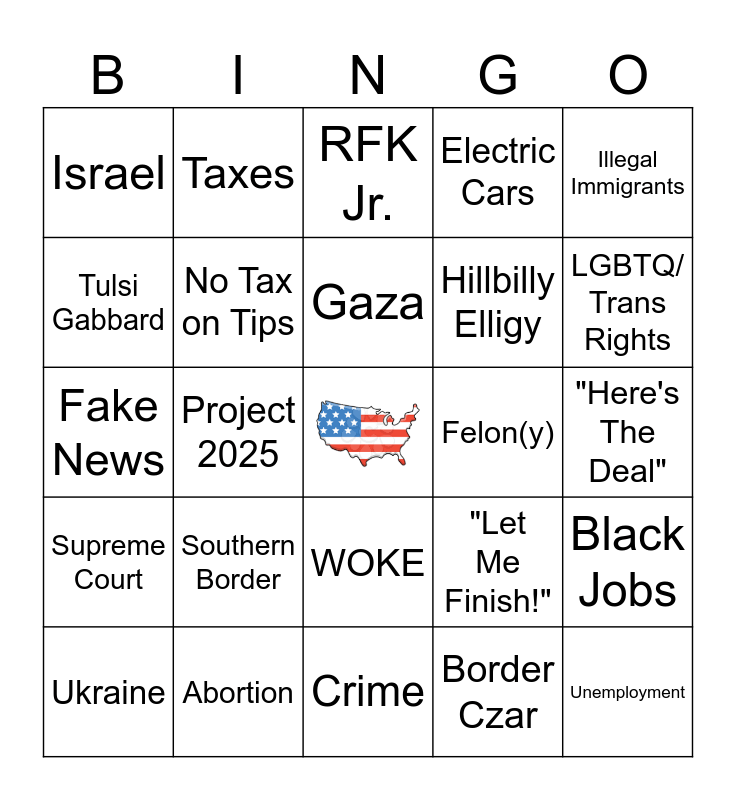 This bingo card has a free space and 56 words: China, Ukraine, J6, Israel, Crime, Healthcare, No Tax on Tips, America First, Hillbilly Elligy, 2nd Ammendment, Electric Cars, HAMAS, Medicare or Medicaid, Critical Race Theory, Weird, Middle Class, Illegal Immigrants, Project 2025, Military Reference, Unemployment, Felon(y), Constitution, "Let Me Finish!", RFK Jr., Elon Musk, Gaza, Big Pharma, Broken System, LGBTQ/ Trans Rights, Bidenomics, Inflation, Deep State, FBI, Covid, "Here's The Deal", Tulsi Gabbard, Fake News, Witch Hunt, Supreme Court, Taxes, WOKE, "Let's Be Clear", The Wall, Education, Kamala Laughs, Southern Border, Abortion, Assassination Attempt, Radical Left, Social Security, Border Czar, Tampons in Men's Restrooms, Stolen Election, MAGA, Black Jobs and Climate Change.