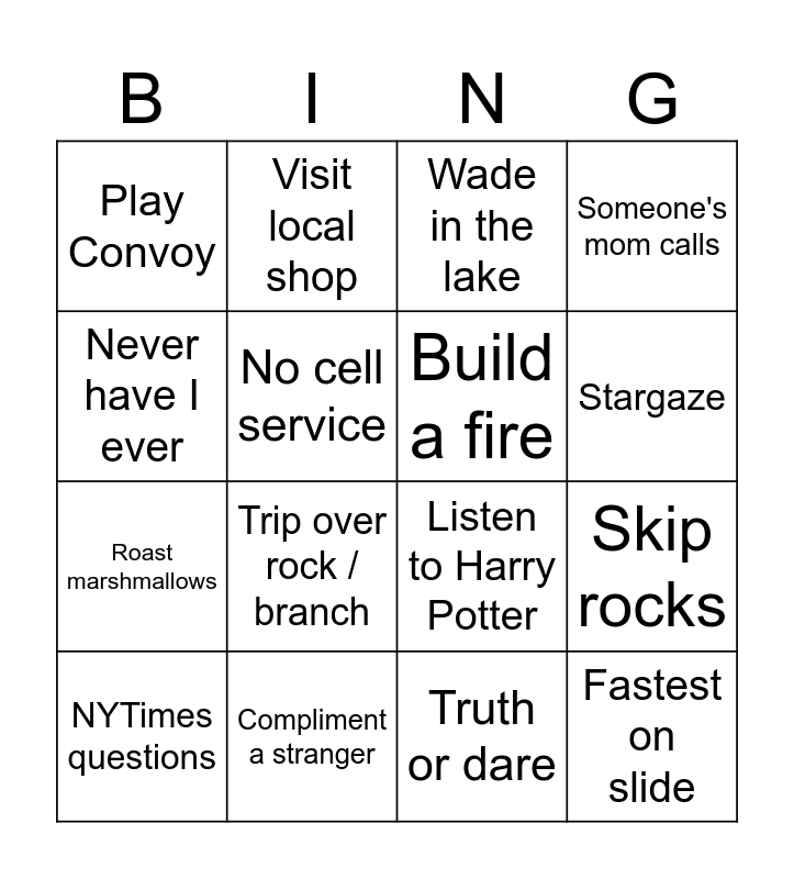 This bingo card has 16 words: Compliment a stranger, Skip rocks, Wade in the lake, Play Convoy, Roast marshmallows, Visit local shop, Listen to Harry Potter, Truth or dare, Never have I ever, No cell service, NYTimes questions, Someone's mom calls, Trip over rock / branch, Stargaze, Build a fire and Fastest on slide.
