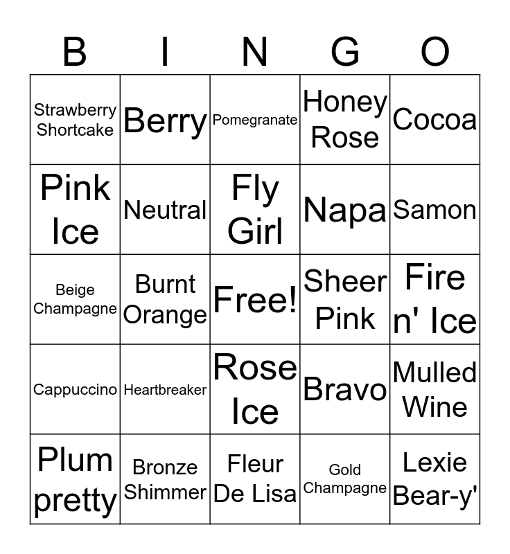 This bingo card has a free space and 72 words: Brick, Berry, Burnt Orange, Coral Ice, Dark Pink, First Love, Honey Rose, Luv it, Napa, Peach, Plum pretty, Raisin, Samon, Strawberry Shortcake, Purple Reign, Beige Champagne, Bravo, Cocoa, Currant, Fire n' Ice, Heartbreaker, Lexie Bear-y', Mulled Wine, Party Pink, Plum, Precious Topaz, Roseberry, Spice Ice, Carmel Apple, B.Ruby, Bronze Shimmer, Caramel Latte, Crimson Red, Electric Tangerine, Gold Champagne, Kiss Me Katie, Mojave, Nutmeg, Pink Ice, Praline Rose, Rose Ice, SheLaLa, Blu-Red, Aussie Rose, Blackberry, Cappuccino, Cranberry, Dusty Rose, Fuscia, Kiss for a Cause, Moca, Nude, Rhubarb, Sheer Pink, Violet Volt, Pink Champagne, Pomegranate, Fly Girl, Army Pink, Bombshell, C. Coral, Coral Reef, Dawn Rising, Fleur De Lisa, Kelly's Krush, Mauve Ice, Neutral, Persimmon, Plumeria, Red Cherry, Sheer Berry and Summer Sunset.