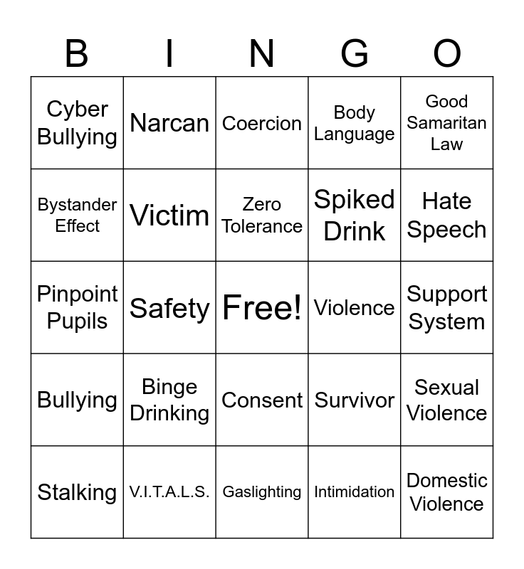 This bingo card has a free space and 37 words: Active Bystander, Hazing, Peer Pressure, Victim, Sexual Violence, Binge Drinking, Zero Tolerance, Medical Immunity, Good Samaritan Law, Bystander, Safety, Body Language, Domestic Violence, Support System, Bystander Effect, Bullying, Sexual Harassment, Coercion, Consent, Violence, Cyber Bullying, Hate Speech, Stalking, Gaslighting, Humiliation, Intimidation, Narcan, Opioids, Overdose, Fentanyl, 911, V.I.T.A.L.S., Pinpoint Pupils, Reporting, Survivor, Spiked Drink and Doxxing.