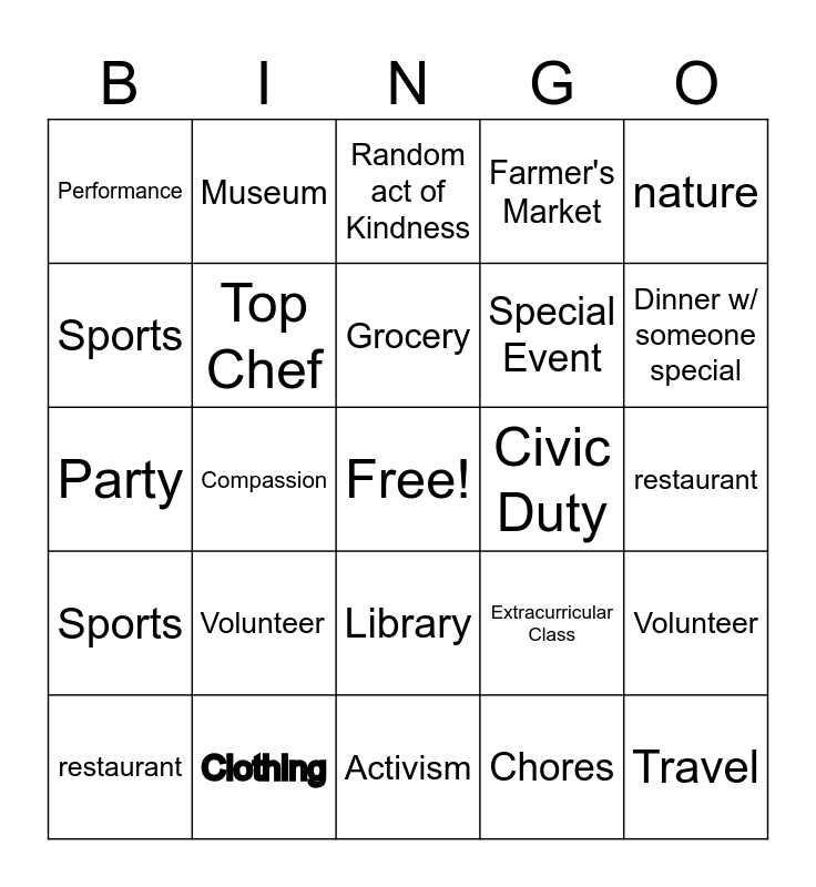 This bingo card has a free space and 24 words: Volunteer, Clothing, Grocery, restaurant, nature, Performance, Sports, Museum, Civic Duty, Library, Special Event, Party, Extracurricular Class, Volunteer, Top Chef, Chores, restaurant, Random act of Kindness, Dinner w/ someone special, Compassion, Travel, Sports, Farmer's Market and Activism.