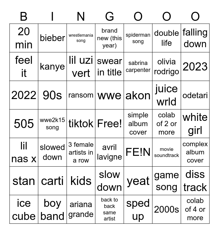 This bingo card has a free space and 48 words: yeat, olivia rodrigo, back to back same artist, wwe2k15 song, ransom, white girl, bieber, boy band, double life, avril lavigne, falling down, brand new (this year), juice wrld, akon, stan, colab of 2 or more, feel it, 2023, game song, spiderman song, sabrina carpenter, tiktok, 20 min, kanye, diss track, lil uzi vert, odetari, ice cube, wwe, 90s, 2000s, simple album cover, complex album cover, carti, 505, FE!N, movie soundtrack, 2022, 3 female artists in a row, kids, lil nas x, colab of 4 or more, wrestlemania song, ariana grande, swear in title, slow down, slowed down and sped up.