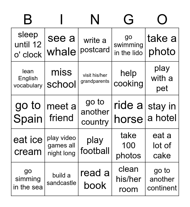 This bingo card has a free space and 24 words: go simming in the sea, play video games all night long, visit his/her grandparents, clean his/her room, take a photo, sleep until 12 o' clock, see a whale, write a postcard, ride a horse, stay in a hotel, go to Spain, miss school, take 100 photos, eat a lot of cake, lean English vocabulary, build a sandcastle, read a book, go swimming in the lido, play with a pet, eat ice cream, meet a friend, play football, help cooking and go to another continent.
