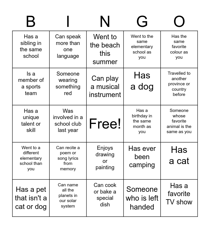 This bingo card has a free space and 24 words: Can recite a poem or song lyrics from memory, Can name all the planets in our solar system, Can play a musical instrument, Has a pet that isn't a cat or dog, Has the same favorite colour as you, Has a sibling in the same school, Is a member of a sports team, Can speak more than one language, Has a birthday in the same month as you, Enjoys drawing or painting, Has a dog, Has a unique talent or skill, Has ever been camping, Has a cat, Someone wearing something red, Someone who is left handed, Someone whose favorite animal is the same as you, Went to the beach this summer, Travelled to another province or country before, Was involved in a school club last year, Has a favorite TV show, Went to a different elementary school than you, Went to the same elementary school as you and Can cook or bake a special dish.