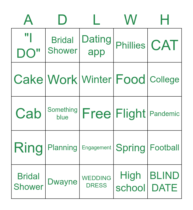 This bingo card has a free space and 49 words: Giraffes, BLIND DATE, Harry Potter, WEDDING DRESS, Planning, Gimlet, Bridal Shower, HOLDING HANDS, Cake, George, Work, Phillies, Football, Spring, Chores, HIS MOM, Winter, Flight, Barcelona, CAT, Something blue, High school, "I DO", Food, Team, College, Bridal Shower, Friends, Engagement, Ring, Retire, House, Eloping, Fai, Dwayne, Jess, Sneaky, Vacay, Pandemic, Adopted giraffe, All About Me, Greece, Bungee jumping, Sister, Cab, Dating app, Hard Rock, Gryffindor and Rockclimbing.