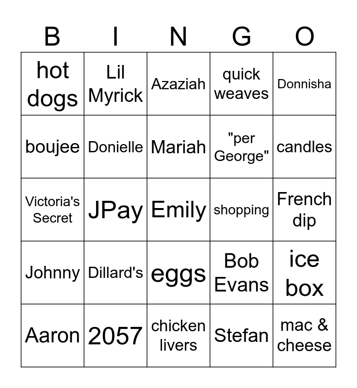 This bingo card has a free space and 34 words: Terrell, Stefan, Lilly, Donna Sue, Johnny, Donielle, Donnisha, Aaron, Lil Myrick, Messiah, Mariah, Azaziah, Mason, Deeeeeeeee, shopping, candles, 2057, Victoria's Secret, Dillard's, Bob Evans, eggs, onions, hot dogs, French dip, chicken livers, mac & cheese, quick weaves, bestie Carla, "per George", boujee, tattoos, JPay, ice box and video calls.