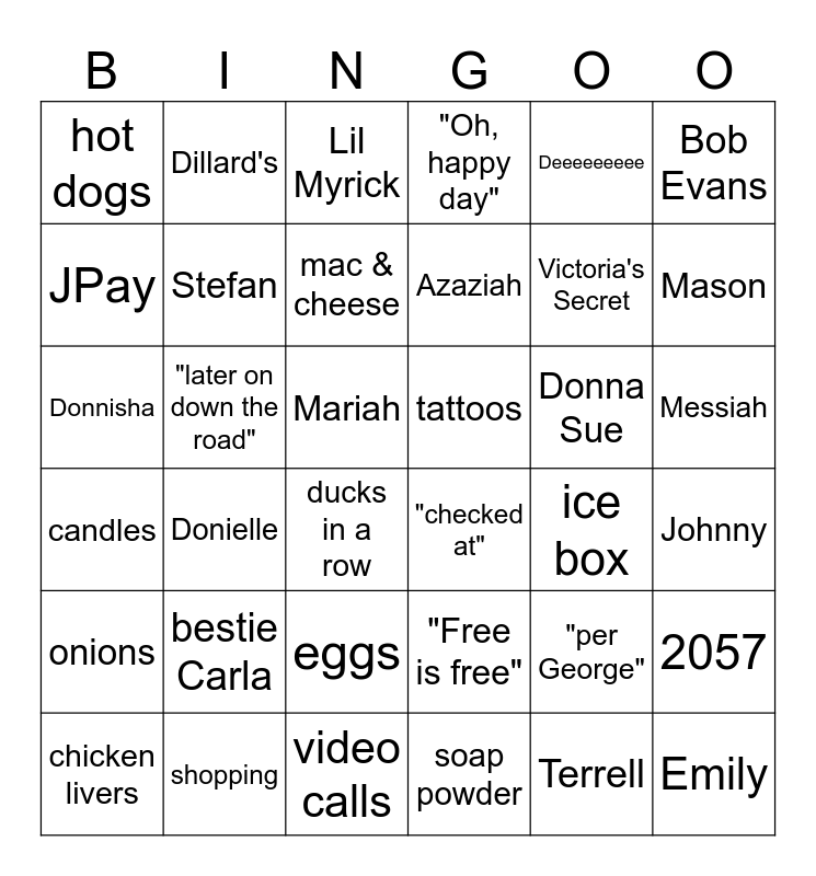 This bingo card has 42 words: Terrell, Stefan, Lilly, Donna Sue, Johnny, Donielle, Donnisha, Aaron, Lil Myrick, Messiah, Mariah, Azaziah, Mason, Deeeeeeeee, shopping, candles, 2057, Victoria's Secret, Emily, Dillard's, Bob Evans, eggs, onions, hot dogs, French dip, chicken livers, mac & cheese, quick weaves, bestie Carla, "per George", boujee, tattoos, JPay, ice box, video calls, ducks in a row, "checked at", "later on down the road", "Free is free", soap powder, "Oh, happy day" and "old school".