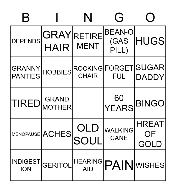 This bingo card has a free space and 24 words: ACHES, GERITOL, ROCKING CHAIR, INDIGEST ION, HUGS, DEPENDS, GRANNY PANTIES, GRAY HAIR, 60 YEARS, OLD SOUL, FORGET FUL, TIRED, WALKING CANE, HREAT OF GOLD, HOBBIES, PAIN, BINGO, RETIRE MENT, SUGAR DADDY, GRAND MOTHER, WISHES, MENOPAUSE, BEAN-O (GAS PILL) and HEARING AID.
