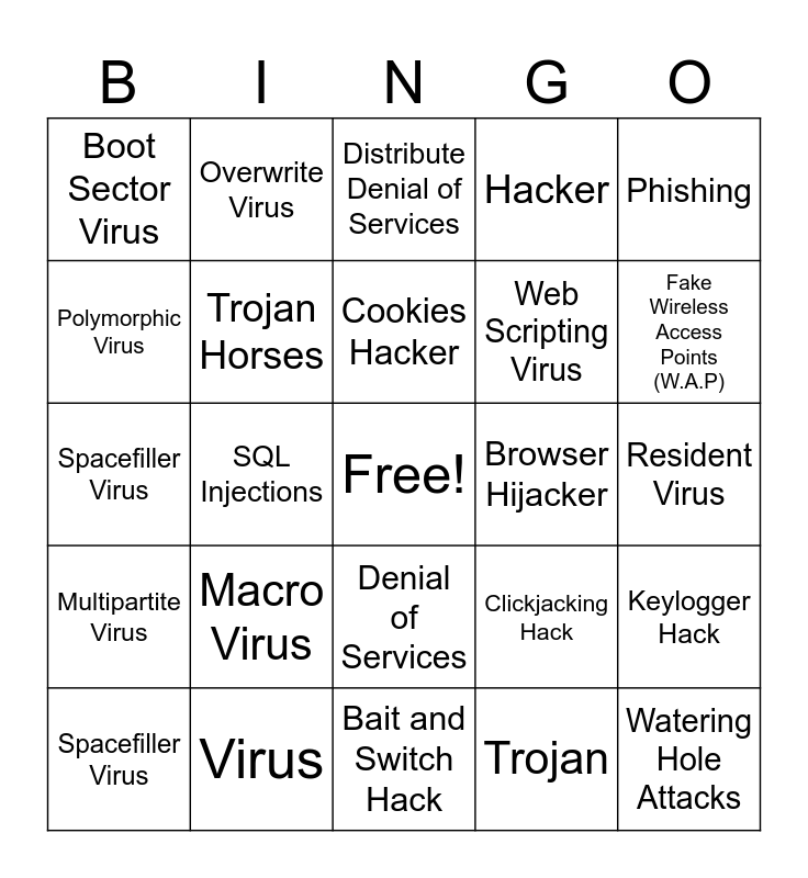 This bingo card has a free space and 25 words: Macro Virus, Bait and Switch Hack, Cookies Hacker, Spacefiller Virus, Phishing, Boot Sector Virus, Polymorphic Virus, Overwrite Virus, Browser Hijacker, Denial of Services, Web Scripting Virus, Spacefiller Virus, Clickjacking Hack, Keylogger Hack, Trojan Horses, Theft of Cookies, Resident Virus, Distribute Denial of Services, Fake Wireless Access Points (W.A.P), SQL Injections, Watering Hole Attacks, Virus, Multipartite Virus, Hacker and Trojan.