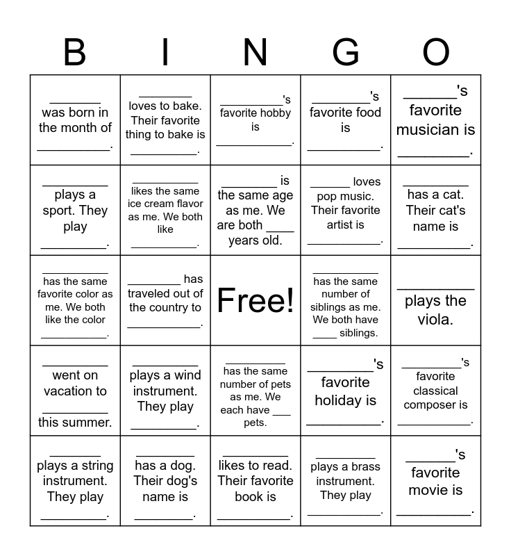 This bingo card has a free space and 24 words: _________ plays a wind instrument. They play _________., ________ has a dog. Their dog's name is ________., ________ is the same age as me. We are both ____ years old., _______ plays a string instrument. They play _________., ______'s favorite musician is ________., _______ was born in the month of __________., _________ plays a sport. They play _________., ________ loves to bake. Their favorite thing to bake is __________., ___________ has the same number of siblings as me. We both have ____ siblings., __________ has the same number of pets as me. We each have ___ pets., ______ loves pop music. Their favorite artist is ___________., ___________ has the same favorite color as me. We both like the color ___________., ________'s favorite holiday is _________., _________'s favorite classical composer is ___________., ___________ likes the same ice cream flavor as me. We both like ___________., _________ plays a brass instrument. They play ___________., _________ plays the viola., __________'s favorite hobby is ____________., _________ has a cat. Their cat's name is __________., ________ has traveled out of the country to ___________., ______'s favorite movie is _________., _________ went on vacation to _________ this summer., ________'s favorite food is __________. and _________ likes to read. Their favorite book is __________..