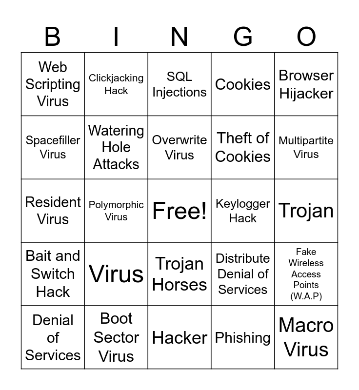 This bingo card has a free space and 24 words: Virus, Boot Sector Virus, Overwrite Virus, Denial of Services, Browser Hijacker, Web Scripting Virus, Spacefiller Virus, Clickjacking Hack, Keylogger Hack, Trojan Horses, Theft of Cookies, Resident Virus, Distribute Denial of Services, Fake Wireless Access Points (W.A.P), Watering Hole Attacks, Phishing, Trojan, SQL Injections, Multipartite Virus, Polymorphic Virus, Macro Virus, Bait and Switch Hack, Cookies and Hacker.