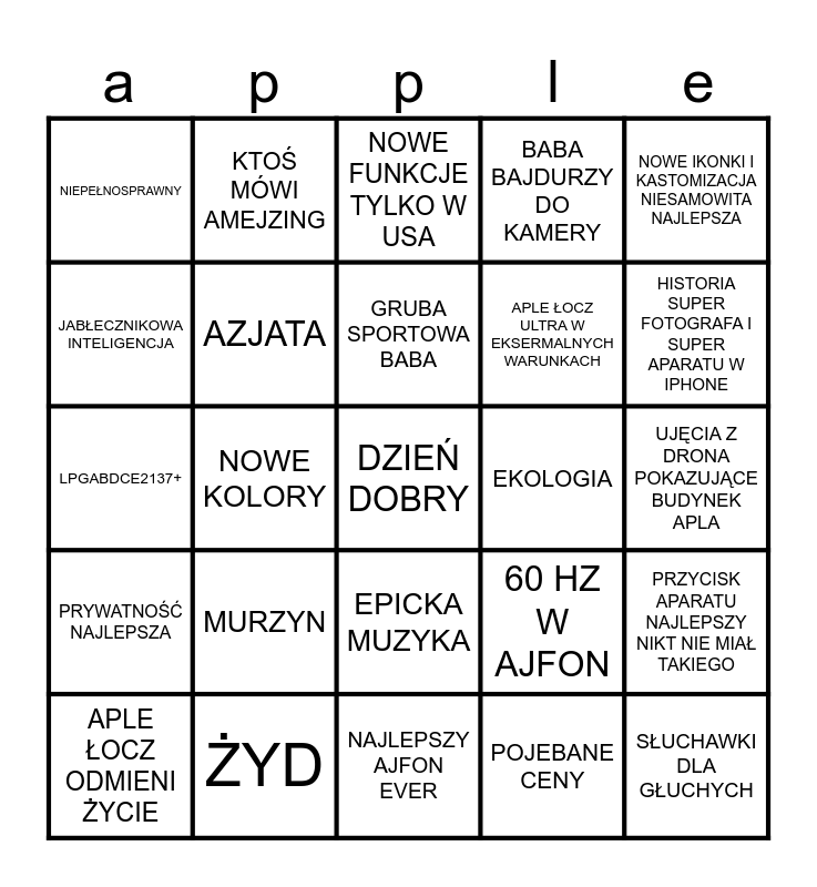 This bingo card has a free space and 24 words: MURZYN, ŻYD, GRUBA SPORTOWA BABA, APLE ŁOCZ ODMIENI ŻYCIE, NOWE IKONKI I KASTOMIZACJA NIESAMOWITA NAJLEPSZA, NIEPEŁNOSPRAWNY, JABŁECZNIKOWA INTELIGENCJA, KTOŚ MÓWI AMEJZING, EKOLOGIA, EPICKA MUZYKA, APLE ŁOCZ ULTRA W EKSERMALNYCH WARUNKACH, LPGABDCE2137+, 60 HZ W AJFON, PRZYCISK APARATU NAJLEPSZY NIKT NIE MIAŁ TAKIEGO, AZJATA, POJEBANE CENY, UJĘCIA Z DRONA POKAZUJĄCE BUDYNEK APLA, NOWE FUNKCJE TYLKO W USA, HISTORIA SUPER FOTOGRAFA I SUPER APARATU W IPHONE, NOWE KOLORY, SŁUCHAWKI DLA GŁUCHYCH, PRYWATNOŚĆ NAJLEPSZA, BABA BAJDURZY DO KAMERY and NAJLEPSZY AJFON EVER.