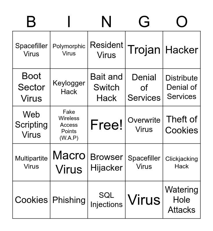 This bingo card has a free space and 25 words: Macro Virus, SQL Injections, Bait and Switch Hack, Cookies, Hacker, Spacefiller Virus, Boot Sector Virus, Polymorphic Virus, Overwrite Virus, Browser Hijacker, Denial of Services, Web Scripting Virus, Spacefiller Virus, Clickjacking Hack, Keylogger Hack, Trojan Horses, Theft of Cookies, Resident Virus, Distribute Denial of Services, Fake Wireless Access Points (W.A.P), Watering Hole Attacks, Phishing, Multipartite Virus, Trojan and Virus.