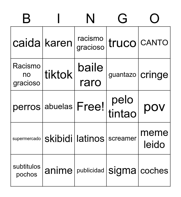 This bingo card has a free space and 24 words: skibidi, anime, baile raro, subtitulos pochos, CANTO, caida, Racismo no gracioso, karen, pelo tintao, latinos, guantazo, perros, screamer, meme leido, tiktok, sigma, pov, racismo gracioso, cringe, abuelas, coches, supermercado, truco and publicidad.