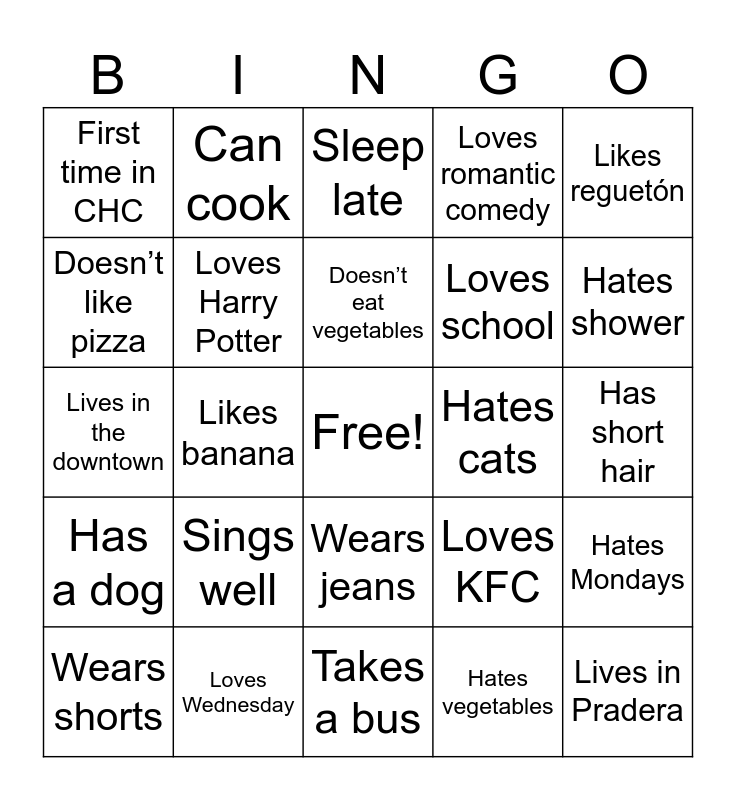 This bingo card has a free space and 35 words: Find some one who is wearing a hat., Doesn’t like soup, Has girlfriend or Boyfriend, Loves Harry Potter, Wears jeans, Loves romantic comedy, Doesn’t like pizza, Loves Mondays, Doesn’t eat vegetables, Short brown hair, Lives in the downtown, Likes reguetón, First time in CHC, Loves Rock music, First time in CHC, Hates cats, Hates vegetables, Likes banana, Has a dog, Lives in Pradera, Loves KFC, Wears shorts, Hates Mondays, Loves Wednesday, Sleep late, Hates shower, Goes to gym, No breakfast, Loves school, Has short hair, Wears a jacket, Takes a bus, Sings well, Can cook and Can’t swim.