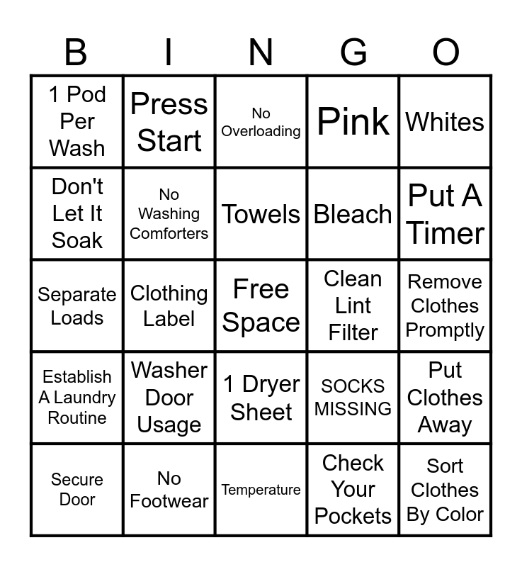 This bingo card has a free space and 29 words: Secure Door, 1/4 Cup, Clothing Label, No Powder Detergent, 1 Pod Per Wash, No Overloading, No Washing Comforters, Washer Door Usage, Clean Lint Filter, No Footwear, Remove Clothes Promptly, Sort Clothes By Color, Temperature, Check Your Pockets, Put A Timer, Stain Remover, 1 Dryer Sheet, Establish A Laundry Routine, Whites, Separate Loads, SOCKS MISSING, Mesh Laundry Bags, Bleach, Don't Let It Soak, Pink, Press Start, Put Clothes Away, Towels and Gather Dirty Clothes.