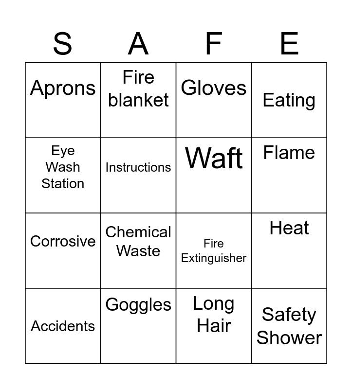 This bingo card has 16 words: Goggles, Heat, Gloves, Aprons, Corrosive, Fire blanket, Fire Extinguisher, Long Hair, Eye Wash Station, Instructions, Accidents, Eating, Chemical Waste, Flame, Waft and Safety Shower.