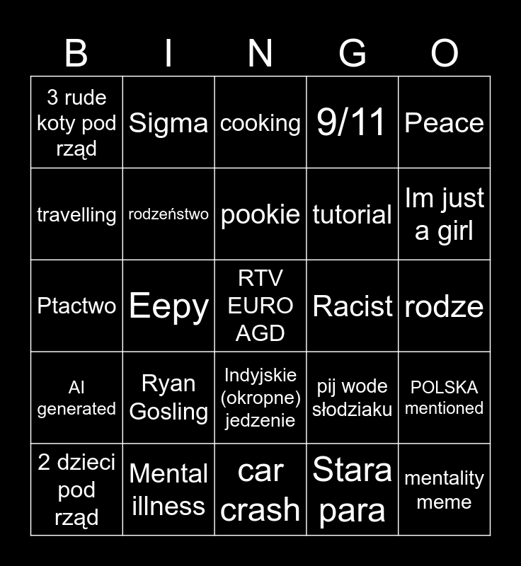This bingo card has a free space and 24 words: 2 dzieci pod rząd, Ryan Gosling, pookie, Stara para, Peace, 3 rude koty pod rząd, Sigma, cooking, Racist, rodze, Ptactwo, rodzeństwo, pij wode słodziaku, POLSKA mentioned, travelling, Mental illness, car crash, 9/11, Im just a girl, AI generated, Eepy, Indyjskie (okropne) jedzenie, tutorial and mentality meme.