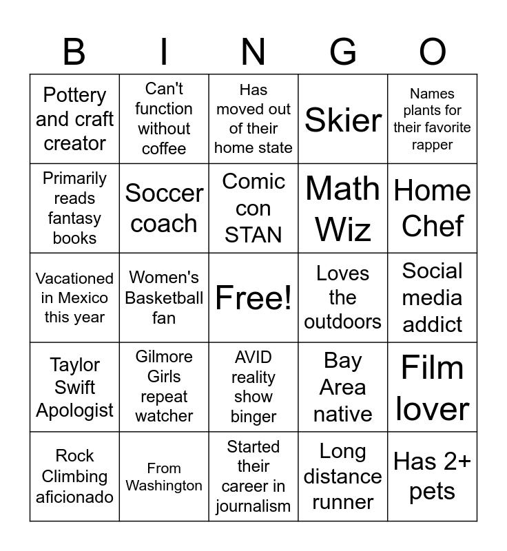 This bingo card has a free space and 24 words: Gilmore Girls repeat watcher, From Washington, Comic con STAN, Rock Climbing aficionado, Names plants for their favorite rapper, Pottery and craft creator, Primarily reads fantasy books, Can't function without coffee, Loves the outdoors, AVID reality show binger, Math Wiz, Vacationed in Mexico this year, Bay Area native, Film lover, Soccer coach, Long distance runner, Social media addict, Has moved out of their home state, Home Chef, Women's Basketball fan, Has 2+ pets, Taylor Swift Apologist, Skier and Started their career in journalism.