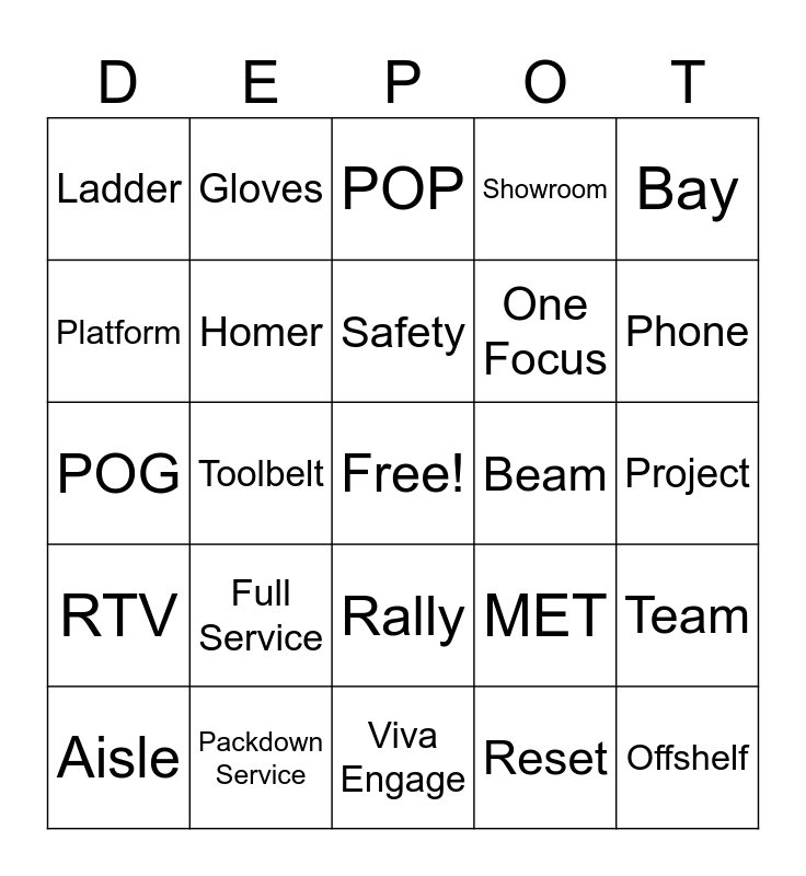 This bingo card has a free space and 24 words: Full Service, Packdown Service, Safety, Aisle, Bay, Ladder, Platform, Gloves, Beam, Rally, One Focus, POG, MET, Team, Homer, Reset, Project, POP, Phone, Toolbelt, Offshelf, RTV, Showroom and Viva Engage.