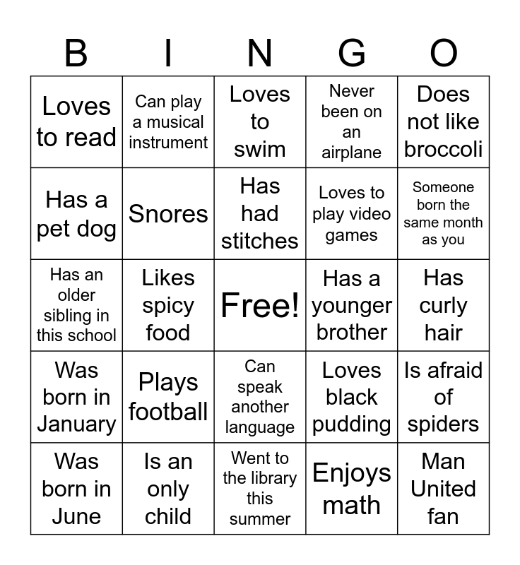 This bingo card has a free space and 32 words: Enjoys math, Arsenal san, Likes spicy food, Can cook food, Was born in January, Snores, Does not like broccoli, Is afraid of spiders, Can play a musical instrument, Has fainted or thrown up in public, Has had stitches, Loves to swim, Can use chopsticks, Can whistle, Has a younger brother, Is left-handed, Was born in June, Has an older sibling in this school, Can speak another language, Plays football, Loves black pudding, Hates pizza, Has curly hair, Is an only child, Man United fan, Never been on an airplane, Loves to play video games, Has a pet dog, Loves to read, Went to the library this summer, Has ridden a horse and Someone born the same month as you.