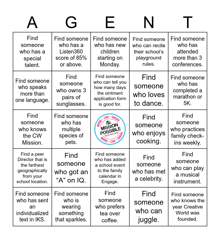 This bingo card has a free space and 24 words: Find someone who got an “A” on IQ., Find someone who is wearing something that sparkles., Find someone who can tell you how many days the ointment application form is good for., Find someone who has sent an individualized text in IKS., Find someone who has attended more than 3 conferences., Find someone who has a special talent., Find someone who speaks more than one language., Find someone who has a Listen360 score of 85% or above., Find someone who enjoys cooking., Find someone who has added a school event to the family calendar in Engage., Find someone who loves to dance., Find someone who knows the CW Mission., Find someone who has met a celebrity., Find someone who can play a musical instrument., Find someone who owns 3 pairs of sunglasses., Find someone who can juggle., Find someone who practices family check-ins weekly., Find someone who has new children starting on Monday., Find someone who has completed a marathon or 5K., Find someone who has multiple species of pets., Find someone who knows the year Creative World was founded., Find a peer Director that is the farthest geographically from your school location., Find someone who can recite their school’s playground rules. and Find someone who prefers tea over coffee..
